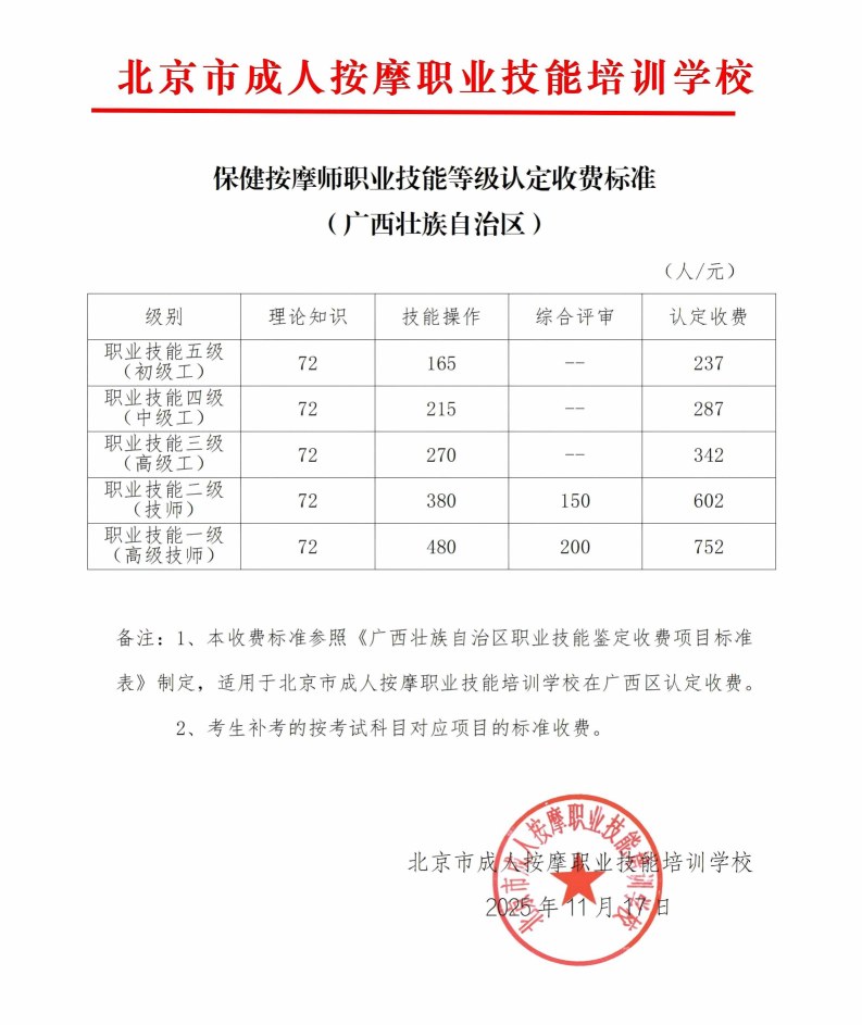 保健按摩师职业技能等级认定收费标准(广西壮族自治区)