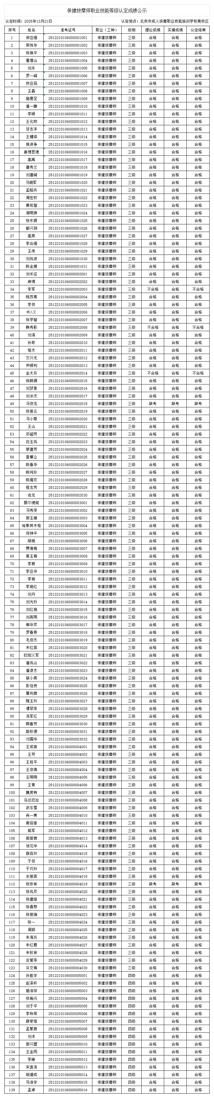 依据人社部《职业技能等级认定工作规程(试行)》(人社职司便函﹝2020﹞17号)及北京市成人按摩职业技能培训学校职业技能等级认定管理制度有关规定,现对2025年12月21日保健按摩师职业技能等级认定成绩予以公示。