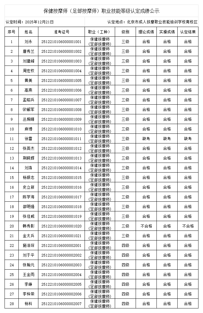 依据人社部《职业技能等级认定工作规程(试行)》(人社职司便函﹝2020﹞17号)及北京市成人按摩职业技能培训学校职业技能等级认定管理制度有关规定,现对2025年12月21日保健按摩师(足部按摩师)职业技能等级认定成绩予以公示。